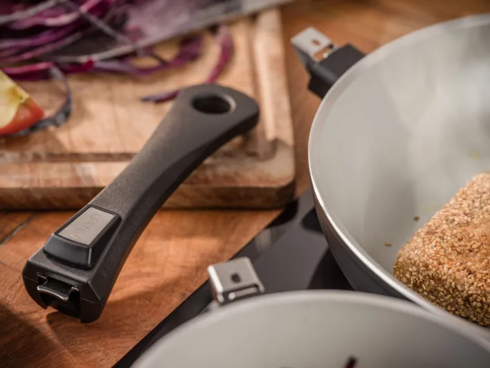 Die Berndes Bratpfanne B.PERFECT aus Aluminium hat 28 cm Durchmesser und kommt ohne Stiel in die Küche. Durch den gesondert erhältlichen Stiel sind die Pfannen und Töpfe der Serie besonders nachhaltig, denn der Stiel passt an jedes Kochgeschirr.