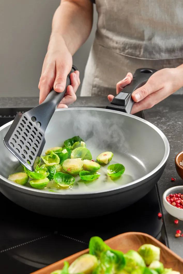 Die Berndes Bratpfanne B.PERFECT besteht aus recycelten Aluminiumdosen und ist mit einer rein mineralischen, selbstverständlich PFAS-freien Quarz-Versiegelung versehen. Mit ihrer hochwertigen Versiegelung ist sie perfekt für fettarmes Braten von Fleisch und Gemüse geeignet. Darüber hinaus bietet sie einen Vollflächen-Induktionsboden, der die Hitze schnell und gleichmäßig verteilt. Der fehlende Stiel macht die Bratpfanne nicht nur besonders umweltfreundlich, sondern spart zudem Platz in der Küche. Außerdem lässt sie sich ohne Griff uneingeschränkt im Backofen verwenden.