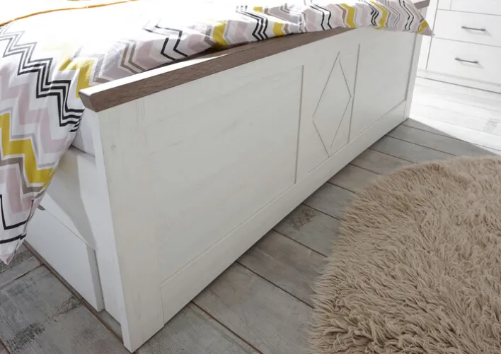 Das Bett aus der COUNTRY-Serie besticht durch sein elegantes Landhausdesign und bietet eine großzügige Liegefläche von 180 x 200 cm. Die Kombination aus weißer Hauptfarbe und dekorativen Pinie-Nachbildungen verleiht dem Bett eine warme und einladende Ausstrahlung. Die Absetzungen in Trüffel-Nachbildung setzen stilvolle Akzente und unterstreichen das harmonische Gesamtbild.