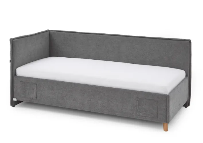 Das Bett FUN, graufarbig mit einer Liegefläche von 90 x 200 cm, besteht aus hochwertigem Polyester. Die braunfarbigen Füße sind aus Eichenholz gefertigt. Das Kinder- bzw. Jugendbett lässt sich aufgrund der Seitenhöhe von 42 cm schnell in ein Sofa umfunktionieren.