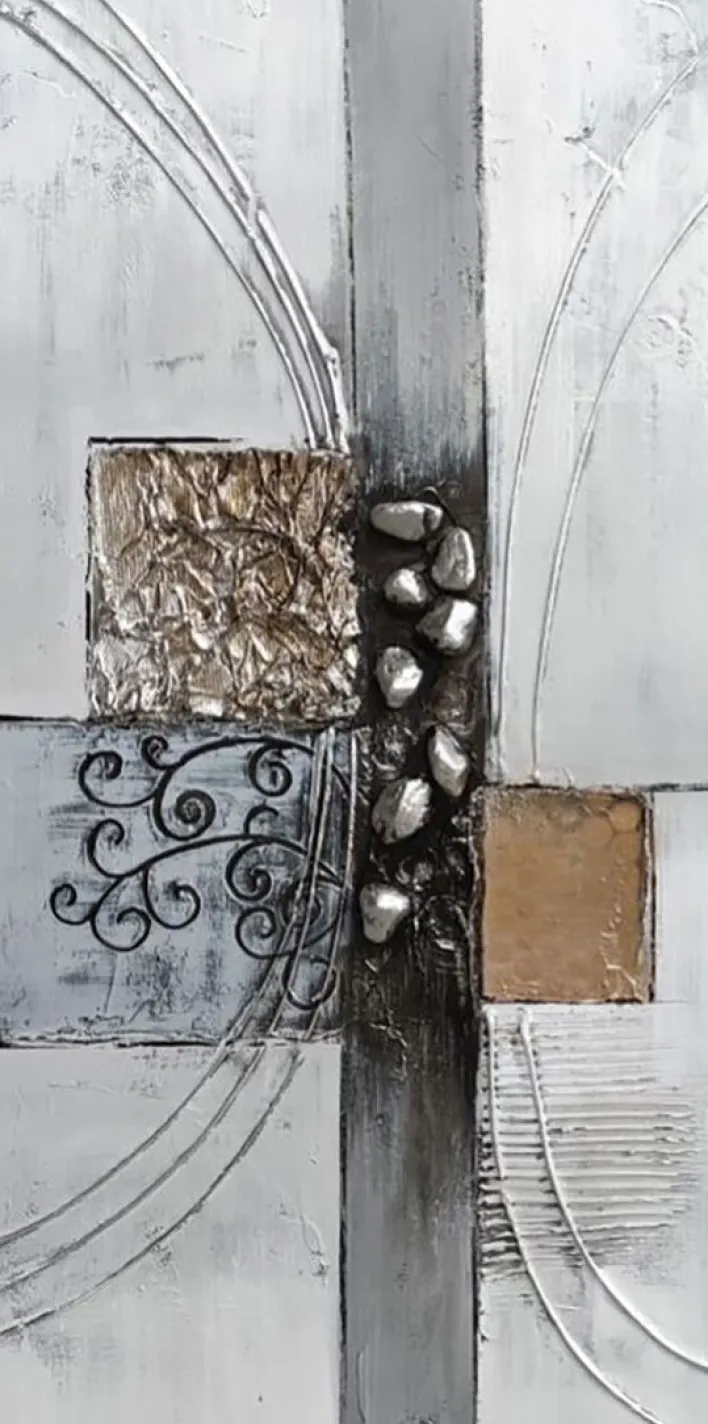 Dieses Wandbild aus der Serie ABSTRAKT ist ein handgearbeitetes Unikat mit rechteckiger Form. Das Bild misst 80 cm in der Höhe und 40 cm in der Breite bei einer Tiefe von 2 cm. Es besteht aus einer Leinwand mit textilem Überzug auf Holzträger und zeichnet sich durch eine mehrfarbige, vorwiegend in silbernen, grauen und beigefarbenen Tönen gehaltene Gestaltung aus. Die Oberfläche ist strukturiert und zeigt reliefartige Bereiche, zum Beispiel metallisch glänzende Steinelemente und plastisch gearbeitete Quadrate. In einem Teilbereich sind dekorative schwarze Linien und Ornamente eingearbeitet, während die Komposition insgesamt von geschwungenen und geradlinigen Reliefstrukturen geprägt ist. Die Farbgebung und Materialkombination unterstreichen den abstrakten Charakter des Bildes. Ein Aufhänger zur Wandmontage ist inklusive. Das Bild eignet sich für den Einsatz im Innenbereich.