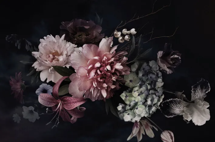 Das Wandbild aus der Serie BLUMEN besticht durch ein detailreiches florales Motiv, das mehrere großformatige Blüten in verschiedenen Farbtönen auf dunklem Hintergrund zeigt. Die Farbauswahl erstreckt sich von zarten Rosé- und Violetttönen bis hin zu gedeckten Grün- und Cremefarben, wodurch ein harmonischer, dennoch kontrastreicher Gesamteindruck entsteht. Die floralen Elemente wirken durch ihre realistische Darstellung und die feine Abstufung der Farbnuancen besonders lebendig. Das Bild präsentiert sich in rechteckiger Form mit den Maßen 78 cm Breite, 118 cm Höhe und einer Tiefe von 1,8 cm.