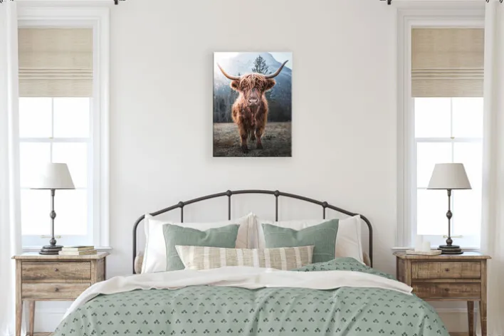 Dieses rechteckige Wandbild zeigt ein Hochlandrind in natürlicher Umgebung vor einer Bergkulisse. Im Vordergrund steht das Tier mit langem, zotteligem Fell in warmen Brauntönen und charakteristisch großen Hörnern. Der Hintergrund ist von winterlichen Bäumen und einem Gebirge geprägt, das Bild vermittelt eine klare, naturgetreue Darstellung des Motivs. Die Farben sind überwiegend naturgetreu und mehrfarbig, wobei das Hochlandrind im Zentrum des Bildes steht und das Gesamtbild dominiert. Das Bild ist 46 cm breit, 61 cm hoch und 1,8 cm tief. Das Gewicht beträgt 0,86 kg. Die Oberfläche besteht aus Leinwand, als Material kommt eine Holznachbildung auf mitteldichter Faserplatte (MDF) zum Einsatz. Das Produkt ist für den Innenbereich geeignet.