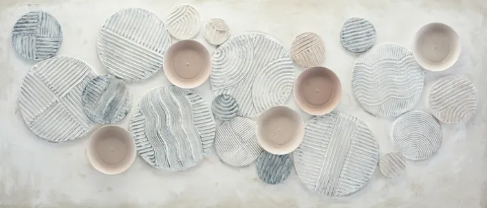Das Design des Bildes ist durch eine Vielzahl von kreisförmigen Elementen geprägt, die in unterschiedlichen Größen und Mustern angeordnet sind. Die Texturen variieren von feinen Linien bis zu wellenförmigen Strukturen, die dem Kunstwerk eine interessante Tiefe verleihen. Die Farbpalette umfasst sanfte Beige- und Grautöne, die harmonisch miteinander kombiniert sind und eine beruhigende Wirkung erzeugen.