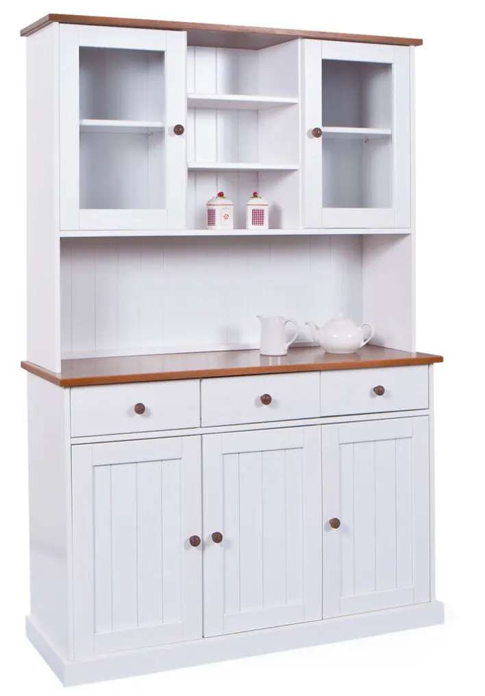 Das Buffet JACOB 6.2 misst 131 x 190 x 45 cm und kombiniert das weiß lackierte Kiefernholz mit Absetzungen in Braun. Durch diese Kombination strahlt das Möbelstück Natürlichkeit aus. Neben der ansprechenden Optik überzeugt der Buffetschrank mit viel Stauraum. Hinter Drehtüren, zum Teil mit Glaseinsatz, finden Geschirr und Gläser Platz, während Besteck in den Schubkästen gut aufgehoben ist. Außerdem bietet das Buffet drei offene Fächer, in denen auch Dekoartikel eine gute Figur machen.