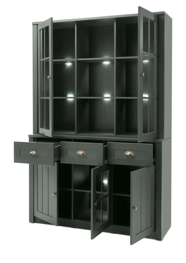 Der Korpus und die Fronten des im Landhausstil gestalteten Küchenschranks sind aus robusten mitteldichten Faserplatten gearbeitet. Drei Schubladen und insgesamt fünf Türen sowie drei offene Fächer sorgen für Ordnung. Die Bereiche hinter den Türen mit Glaseinsatz und die offenen Fächer lassen sich mit Licht erhellen. Die Beleuchtungsmittel gehören nicht zum Lieferumfang. Das Modell steht mit einem Gewicht von rund 97 Kilogramm sicher an der Wand.