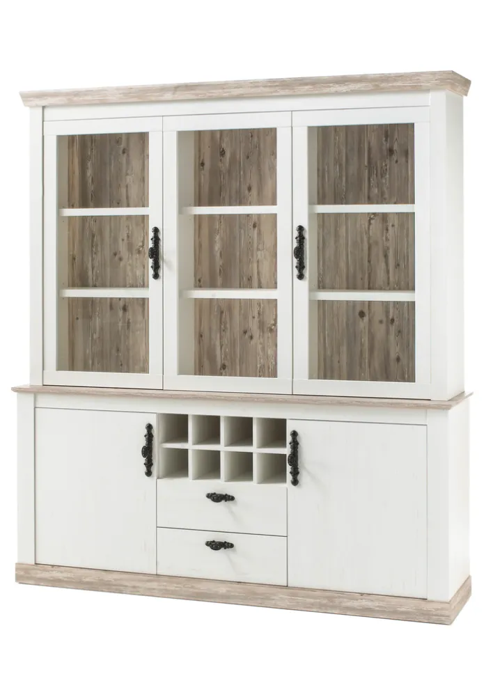 Ob Wohnküche oder Esszimmer: Der große Buffetschrank FLORENZ zieht mit seinem ansprechenden Design den Blick auf sich. Die Applikationen in Pinie-Oslo-Dekor bilden einen stylishen Kontrast zu den weißen Flächen. Im oberen Bereich befinden sich zwei Drehtüren mit Glaseinsatz sowie drei offene Fächer. Hinter den beiden Türen im unteren Bereich stehen je zwei Fächer zur Verfügung. Hinzu kommen zwei geräumige Schubkästen sowie acht Flaschenfächer. Korpus und Fronten sind aus Holznachbildung gefertigt, die Griffe aus Metall.
