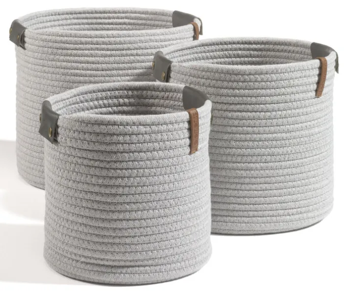 Der casaNOVA Aufbewahrungskorb in dekorativer Seiloptik hat einen Durchmesser von 22 cm. Er hat eine runde Form und ist aus grauem Mischgewebe aus Baumwolle, Polyester und Polyurethan (PU) gefertigt. Die Höhe des Dekokorbs liegt ebenfalls bei 22 cm.