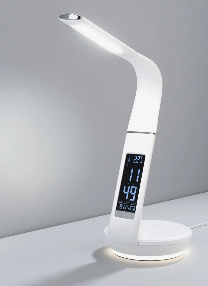 Der Fuß und der Arm der Schreibtischleuchte bestehen aus stabilem Kunststoff. Die Uhr mit LCD-Display hat einen Wecker mit Schlummerfunktion sowie Anzeigen für Zeit, Datum, Kalender und Temperatur. Zusätzlich ist die Uhr mit einer kabellosen Ladestation für Smartphones ausgestattet sowie einem USB Anschluß. Das LED-Leuchtmittel ist fest in das Gehäuse eingebaut.