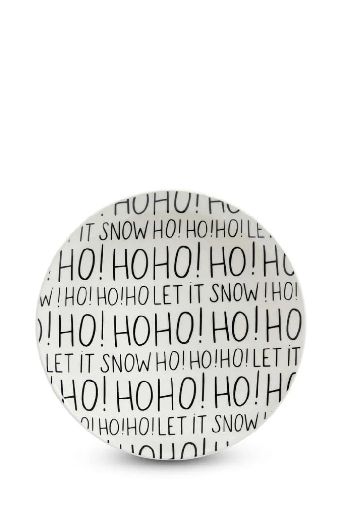 Der runde Teller aus der Serie BLACK FORREST von casaNOVA besteht aus hochwertigem Porzellan und misst 26,5 cm im Durchmesser bei einer Höhe von 2,7 cm. Die Hauptfarbe ist Weiß, ergänzt durch ein auffälliges schwarz-weißes Schriftmuster. Die Oberfläche des Tellers ist mit den wiederholten Schriftzügen „HO! HO! HO!“ und „LET IT SNOW“ in klarer, schwarzer Schrift gestaltet. Das Design vermittelt einen saisonalen Charakter. Die Keramikart ist Porzellan, das für seine Strapazierfähigkeit und glatte Oberfläche bekannt ist.