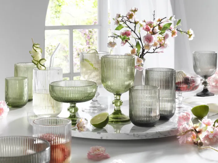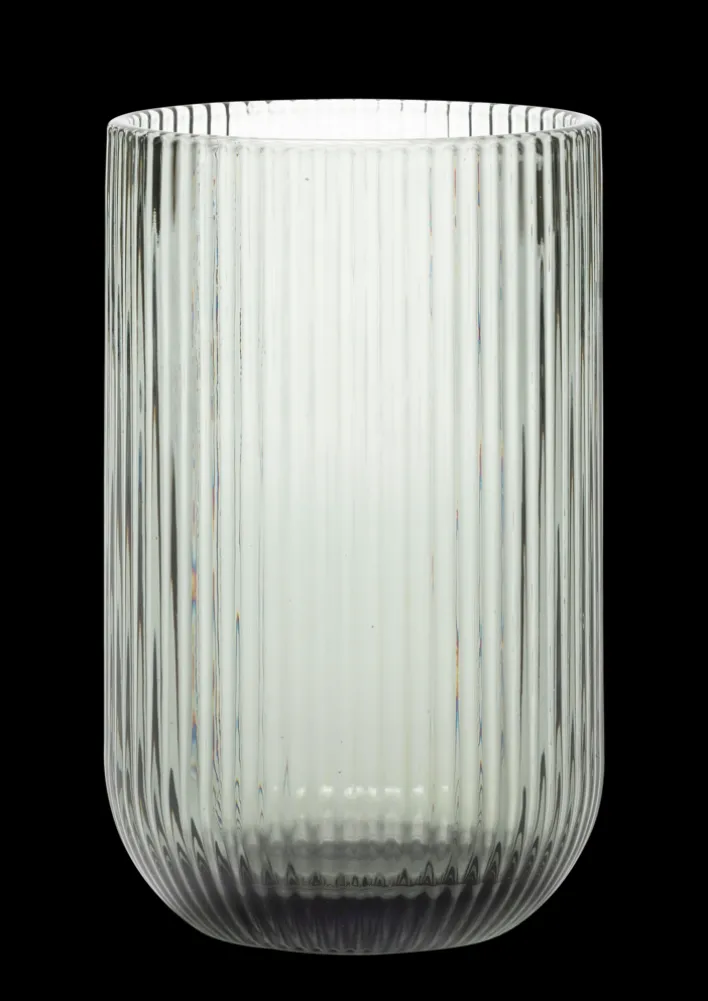 Das graue Trinkglas aus der Reihe RIFFLE hat ein Fassungsvermögen von 465 ml. Die 13-cm-Variante ist in zwei weiteren Farben erhältlich: in Transparent und Grün.