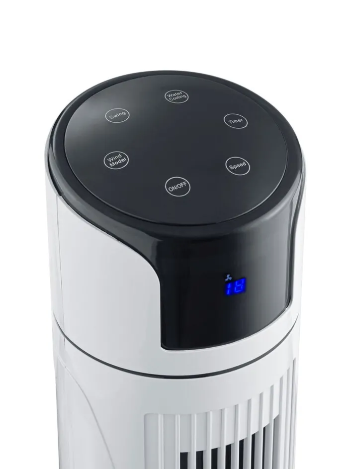 Der schwenkbare Turmventilator COLOMBO vom Hersteller casaNOVA sorgt bei Sommerwetter für einen angenehmen Luftstrom in Wohnräumen und Büros. Die gewünschte Geschwindigkeitsstufe lässt sich direkt über das auf dem Turm befindliche Touchdisplay oder bequem vom Sofa aus mit der Fernbedienung auswählen. Die kühlende Wirkung kann mit Wasser, das über einen Tank aufzufüllen ist, verstärkt werden. Das CE-geprüfte Gerät verfügt außerdem über einen Timer, sodass ein zeitgesteuerter Betrieb möglich ist.