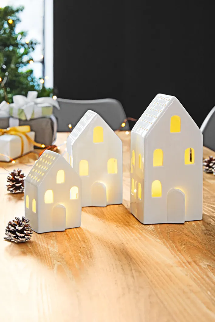 Das Dekohaus besteht aus hochwertigem Porzellan und ist mit mehreren Fenstern sowie einer halb geöffneten Tür ausgestattet. Durch diese schimmert das warmweiße Licht der LEDs, sodass eine warme und gemütliche Stimmung suggeriert wirDurchmesser Dadurch eignet sich das Haus ganz wunderbar für die kalte und dunkle Jahreszeit. Es bietet sich beispielsweise hervorragend für das Weihnachtsfest an, kann aber auch während des restlichen Winters genutzt werden. Die LED-Beleuchtung ist bereits inklusive.