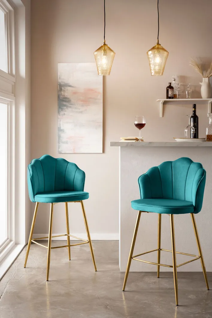 Der CASAVANTI Barhocker misst 53 x 100 x 54 cm und ist mit einer Fußbank ausgestattet. Diese sorgt gemeinsam mit dem gepolsterten Sitz mit halbhoher Rückenlehne für Komfort. Den Sitz mit spannender Muschelform und grünem Samtbezug kombiniert der Barstuhl mit einem goldfarbigen Vierfußgestell aus Metall. Dank stylischer Optik lässt sich der Barhocker mit modernen und klassischen Möbeln kombinieren und verleiht der Hausbar im Nu ein elegantes und gemütliches Ambiente.