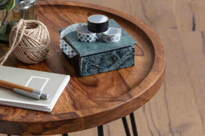 Der Durchmesser der Platte liegt bei 60 cm. Damit ist reichlich Platz vorhanden, wenn eine Tasse, ein Glas und ein Kuchenteller abgestellt werden. Als Beistelltisch kann er neben der Couch oder dem Sessel sowie als Solitär an anderer Stelle stehen. Wird er allein präsentiert, eignet er sich für Dekorationen. Mit seiner attraktiven Optik fällt er sicher ins Auge. Das schmiedeeiserne Fußgestell und die Sheesham-Platte harmonieren perfekt miteinander. Der schicke Tisch wird in Indien gefertigt.