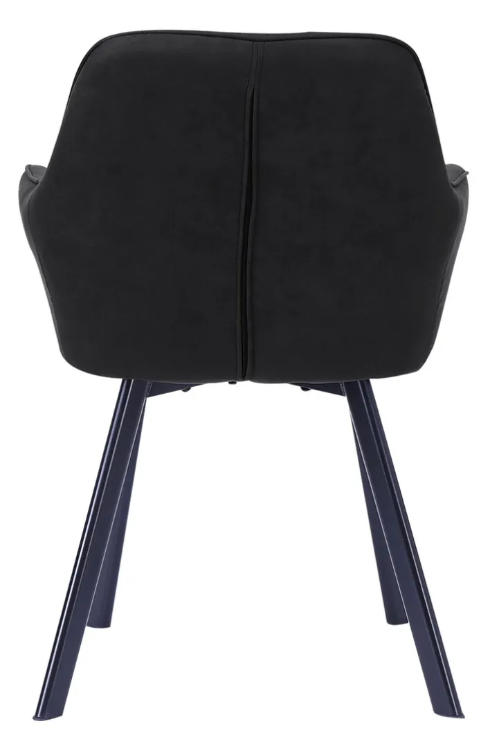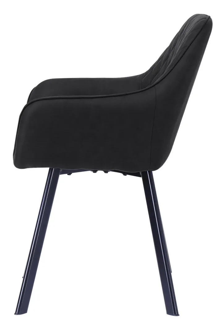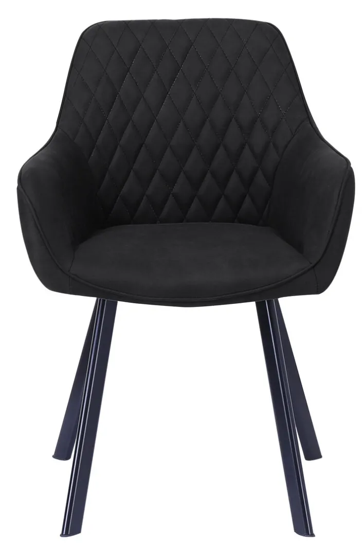 Die Stühle aus dem 2-er Set von CASAVANTI verfügen über ein stabiles Vierfußgestell aus Edelstahl mit schwarzer, pulverbeschichteter Oberfläche. Die Rückenlehne der Stühle geht mit einem leichten Bogen in die Armlehnen über. Sie zeigt sich mit einer dekorativen Rautensteppung, die auf dem dunklen Mikrofaserbezug gut zur Geltung kommt. Die komfortablen Stühle sind 56,5 cm breit, 83 cm hoch und können bis zu 120 kg belastet werden.