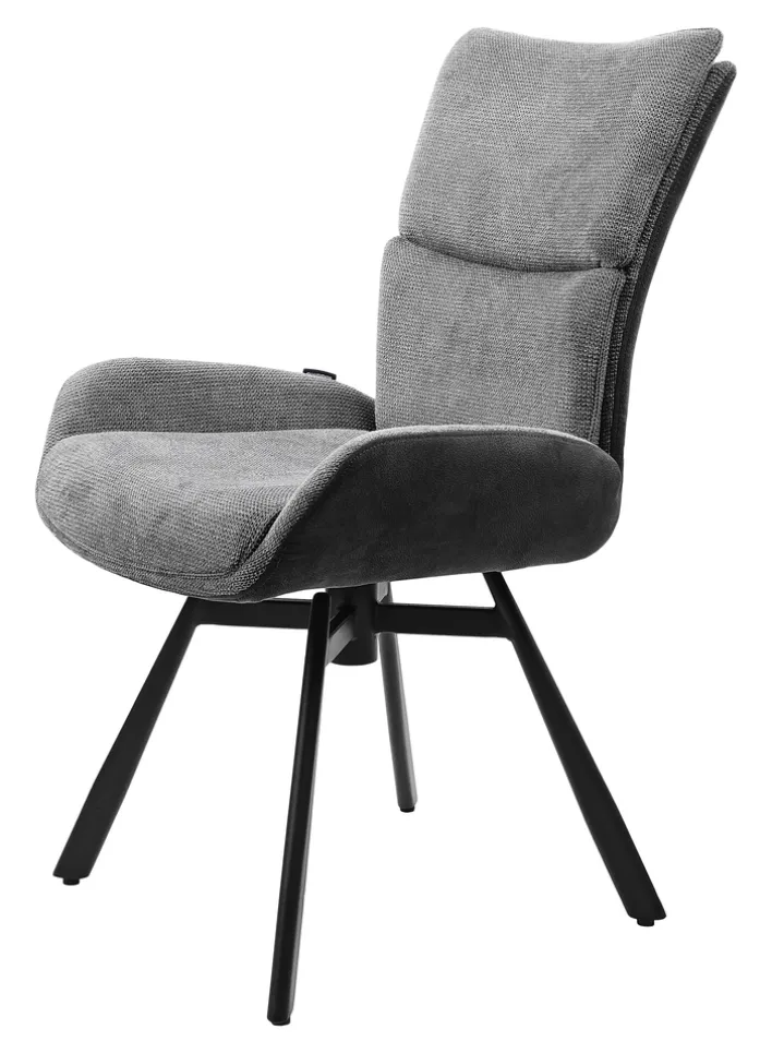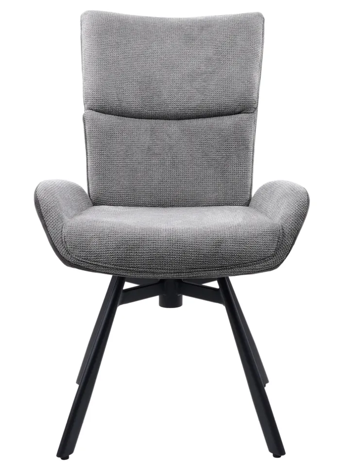 Der Esszimmerstuhl aus der Serie VARREL präsentiert sich in einem modernen Design mit klaren Linien und einem Vierfußgestell. Die Sitzschale und Rückenlehne sind mit einem grauen, strukturierten Textilbezug versehen, der eine dezente und unaufdringliche Optik bietet. Die Oberfläche des Gestells ist pulverbeschichtet und sorgt für eine widerstandsfähige und pflegeleichte Ausführung. Das Gestell aus Metall in Schwarz bildet einen stabilen Kontrast zum grauen Bezug und unterstreicht die moderne Gestaltung des Stuhls. Die großzügig gepolsterte Sitzfläche und die leicht nach außen geschwungenen Armlehnen bieten Komfort beim Sitzen. Die Drehfunktion um 360° ermöglicht Flexibilität im Esszimmeralltag und erleichtert das Hinsetzen und Aufstehen. Mit einer Breite von 64 cm, einer Tiefe von 57 cm und einer Höhe von 93 cm ist der Stuhl auf ergonomische Aspekte ausgelegt. Das Gesamtgewicht beträgt 9,75 kg. Geeignet ist der Esszimmerstuhl für den Einsatz im Esszimmer und fügt sich dank seiner neutralen Farbgestaltung in verschiedene Wohnkonzepte ein.