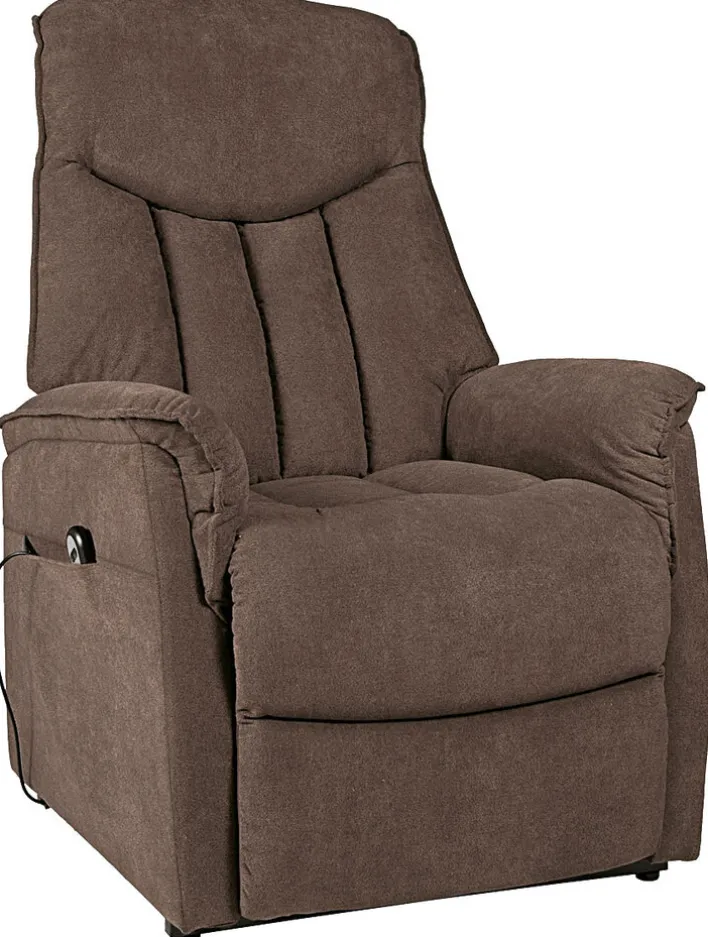 Bei diesem dunkelbraunen TV-Sessel lässt sich der Rücken und das Fußteil mithilfe einer Fernbedienung elektrisch verstellen. Manuell ist auch noch das