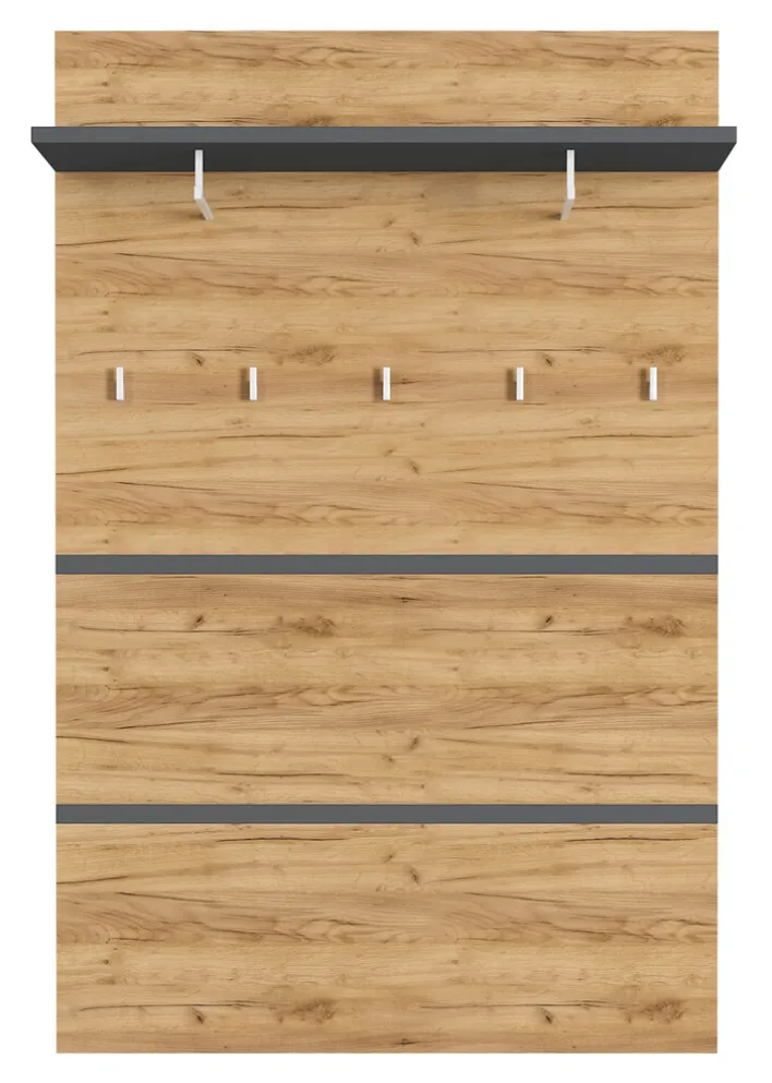 Gefertigt ist das Garderobenpaneel von CASAVANTI aus einer Holznachbildung in Eiche Navarra-Dekor. Anthrazitgraue Absetzungen bilden einen dekorativen Kontrast. Die silberfarbigen Haken und Stangen machen seine Optik komplett. Der Ablageboden des CASAVANTI Garderobenpaneels kann mit einem Gewicht von bis zu 10 kg belastet werden. Jacken, Mäntel, Taschen und Kopfbedeckungen können platzsparend und ordentlich an dem Möbelstück aufgehängt werden, bis sie wieder benötigt werden. Neben einem modern eingerichteten Flur kann der Einrichtungsgegenstand auch im Ankleidezimmer verwendet werden.