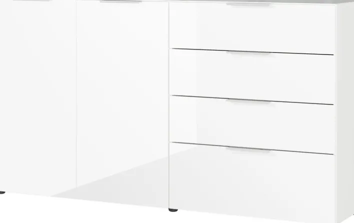 Das geradlinig gestaltete Sideboard OAKLAND von CASVANTI mit einem Stellmaß von 184 x 102 cm überzeugt mit einem zeitlosen Design. Durch seine glänzenden Oberflächen in der Farbe weiß, ist das schöne Möbelstück für moderne Raumkonzepte ideal und mit bereits bestehenden Einrichtungen kombinierbar. Das 2-türige Sideboard ist intelligent mit mehreren Fachböden unterteilt. Zusätzlichen Stauraum bieten vier geräumige Schubkästen.