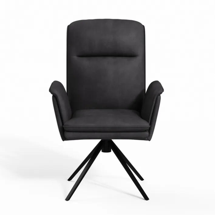 Der Esszimmerstuhl MAILAND bietet mit seinem modernen Design und der klaren Formensprache eine zeitgemäße Sitzlösung für den Wohnbereich. Die Sitzschale ist mit einem dunkelgrauen Microfaser-Textil bezogen, das eine leicht strukturierte, matte Oberfläche zeigt. Die ergonomisch geformte, hohe Rückenlehne und die seitlich ausgeprägten Armlehnen sorgen für eine stabile Sitzposition. Das stabile Vierfußgestell aus schwarzem Metall verleiht dem Stuhl einen festen Stand und unterstreicht die moderne Optik.