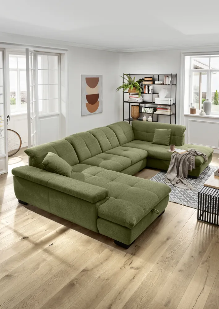 Das Design der Wohnlandschaft zeichnet sich durch klare Linien und eine moderne Ästhetik aus. Der grüne Textilbezug verleiht dem Raum eine frische und einladende Atmosphäre. Die Schenkelmaße von 204 cm links und 211 cm rechts ermöglichen eine optimale Anpassung an verschiedene Raumgrößen. Ein integrierter Bettkasten bietet zusätzlichen Stauraum, während die echt bezogene Rückenlehne die Wohnlandschaft auch frei im Raum platzierbar macht. Diese Wohnlandschaft ist die ideale Wahl für alle, die Wert auf Komfort und modernes Design legen.