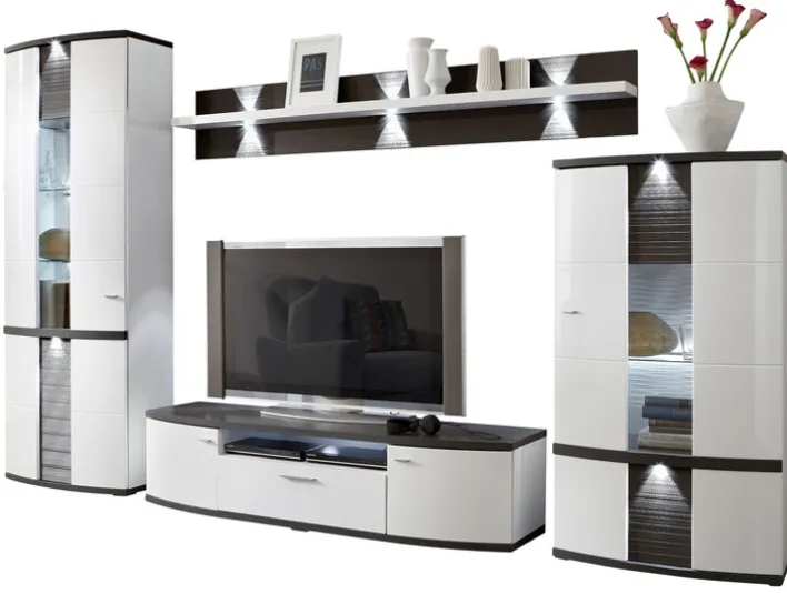 Jedes Element der Wohnwand CABANA aus dem Hause CASAVANTI besteht aus hochwertigem Holzwerkstoff, welcher sich am Korpus in weißem Hochglanz und an der Front foliert in Szene setzt. Ansprechend strukturierte Absetzungen in Grafit-Grau lockern das Erscheinungsbild vorteilhaft auf. Die aus zwei Vitrinen, einem Lowboard und einem Wandboard bestehende Wohnwand CABANA von CASAVANTI stellt hinter teilweise verglasten Türen Platz für die unterschiedlichsten Dinge und Präsentationsraum für Schönes zur Verfügung. Die obere Ablage des Lowboards nimmt einen Fernseher mit großem Bildschirm auf und bietet ein offenes Fach für Receiver und DVD-Player an. Das Wandboard stellt Ablageflächen bereit und gibt Gelegenheit zu dekorativer Kreativität. Alle Elemente der Wohnwand können mit 10 LED-Spots inklusive Trafo ansprechend beleuchtet werden.
