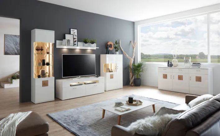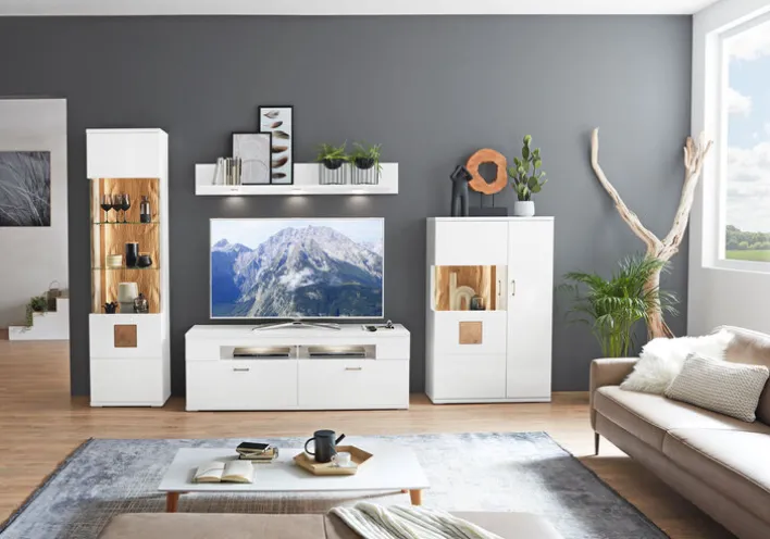 Mit der 4-teiligen CASAVANTI Wohnwand TOPEKA in Weiß/Braun kommt jede Menge Stauraum in das Wohnzimmer. Gleichzeitig begeistern die Möbel mit einem top modernen Design mit rustikalem Twist.