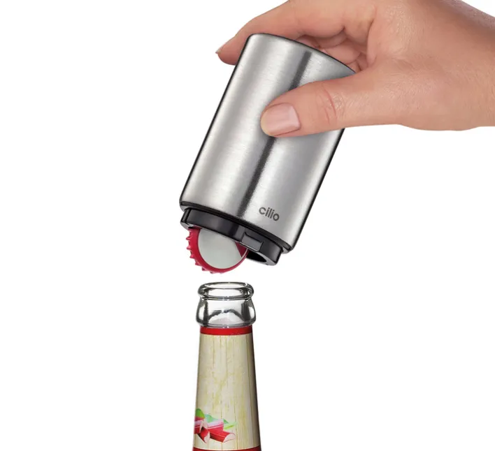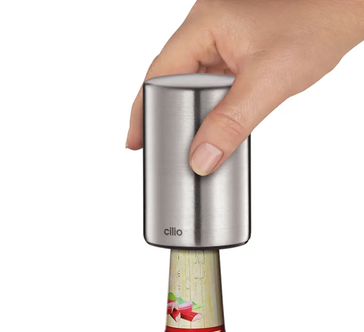 Der Flaschenöffner APERTO des Herstellers cilio – einer Marke für Küchenzubehör, die sich durchdachter Lösungen rühmt – hat die Abmessungen 5,2 x 8,5 cm und passt auf jede handelsübliche Weinflasche. Er zeichnet sich durch ein Öffnungssystem aus, das federgelagert ist und das problemlose Öffnen der Flasche im Handumdrehen gelingen lässt. Weiterhin ist der Flaschenöffner mit einem Magnethalter versehen.