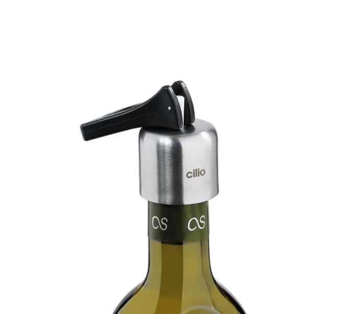 Die Verschlusskappe des cilio Weinflaschenverschlusses LEVA wird aus hochwertigem Edelstahl hergestellt. Der ästhetische Glanz dieses soliden Materials fügt sich harmonisch in das Design vieler Kühlschränke und Kücheneinrichtungen ein. An der Kappe aus Metall ist ein Hebel aus schwarzem Kunststoff befestigt. Mit diesem lässt sich der Flaschenverschluss auf einer geöffneten Flasche so arretieren, dass der Flascheninhalt luftdicht von der Atmosphäre außerhalb der Flasche abgeschirmt werden kann. So behält der edle Tropfen dank dem cilio Weinflaschenverschluss LEVA sein originales Aroma für den Genuss zu einem etwas späteren Zeitpunkt.