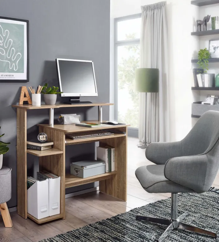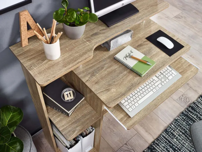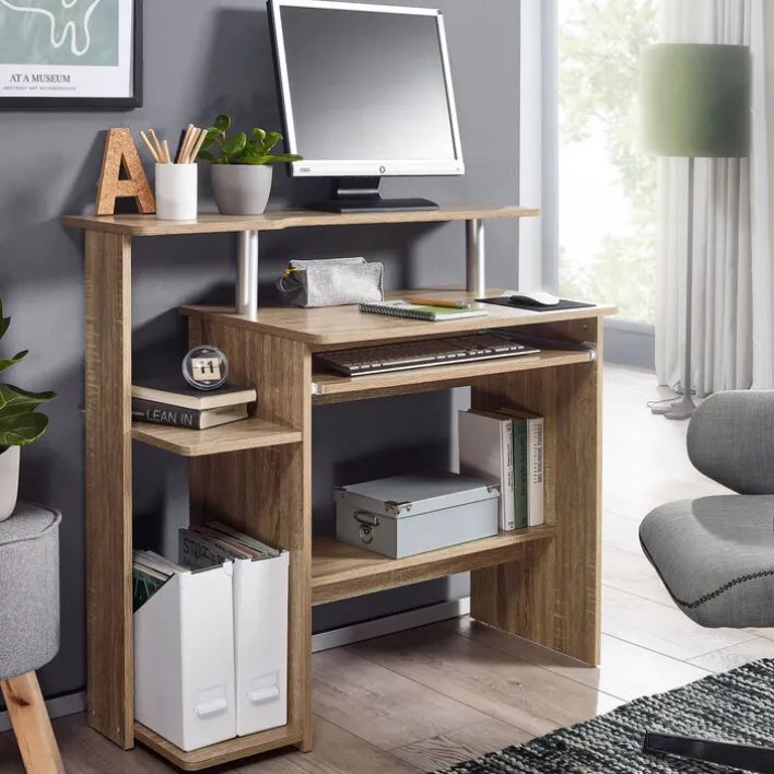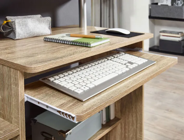 Der braune Computertisch passt in dem feinen Dekor Sonoma in jedes Arbeitszimmer im Haus. Der praktische Tisch mit den Maßen von 48,5 Zentimeter Breite, 94 Zentimeter Länge und 90,5 Zentimeter Höhe ist mit einem platzsparenden Tastaturauszug gestaltet.