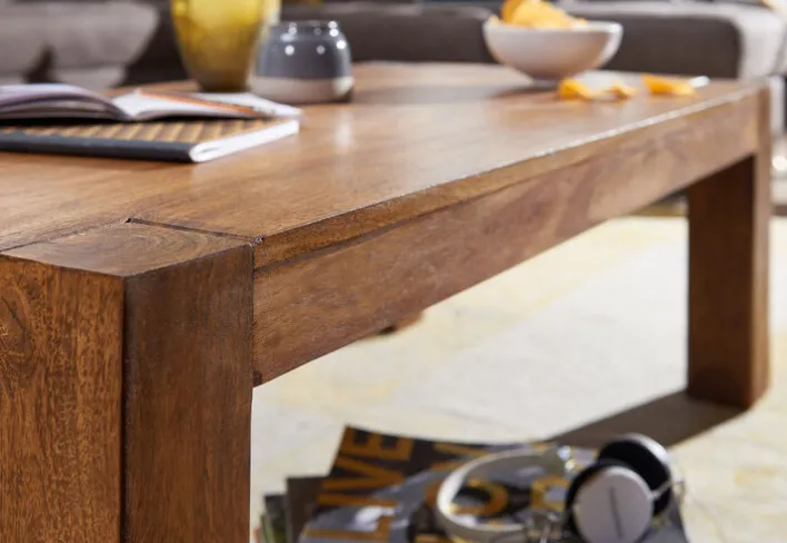 Der Couchtisch überzeugt mit seiner massiven Holzqualität: Sowohl die Tischplatte als auch das Gestell bestehen aus hochwertigem Sheesham Holz. Die Bearbeitung und die Beschichtung der Tischoberfläche erfolgten in sorgfältiger Handarbeit. Der schlicht und elegant wirkende Tisch ist ein attraktiver Blickfang vor modernen Sofas und Sesseln. Die niedrige Höhe und die vorteilhafte Größe machen das Produkt zum idealen Couchtisch.