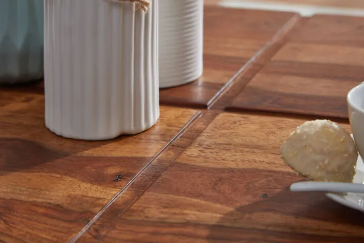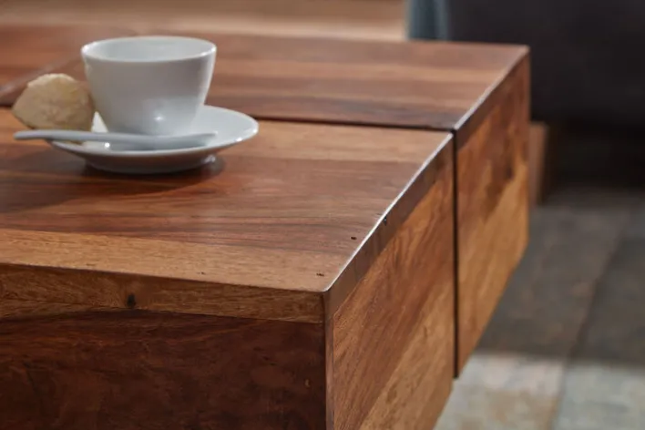 Der Couchtisch in der Ausführung Sheesham massiv hat die Maße 58 x 58 cm. Er besteht aus massivem Holz mit einer attraktiven Maserung, die dem Möbelstück eine rustikale Note verleiht.