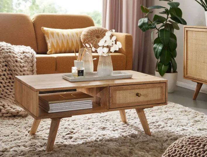 Der niedrige Tisch begeistert mit einer Schublade, deren Front aus Rattan gearbeitet ist. Tischplatte und Vierfußgestell sind aus echtem Mangoholz gestaltet. Das Modell hat ein Eigengewicht von nur zwölf Kilogramm und kann dennoch bis zu 25 Kilogramm belastet werden. Der lackierte Couchtisch ist in Indien garantiert in Handarbeit angefertigt worden.