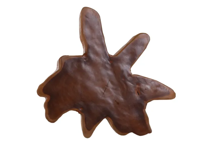 Die Tischplatte aus massivem Teakholz besticht durch ihre organische Form und die warme, braune Farbgebung, die den natürlichen Charme des Holzes unterstreicht.