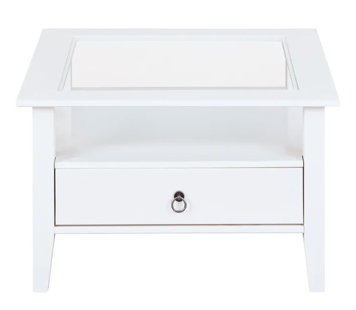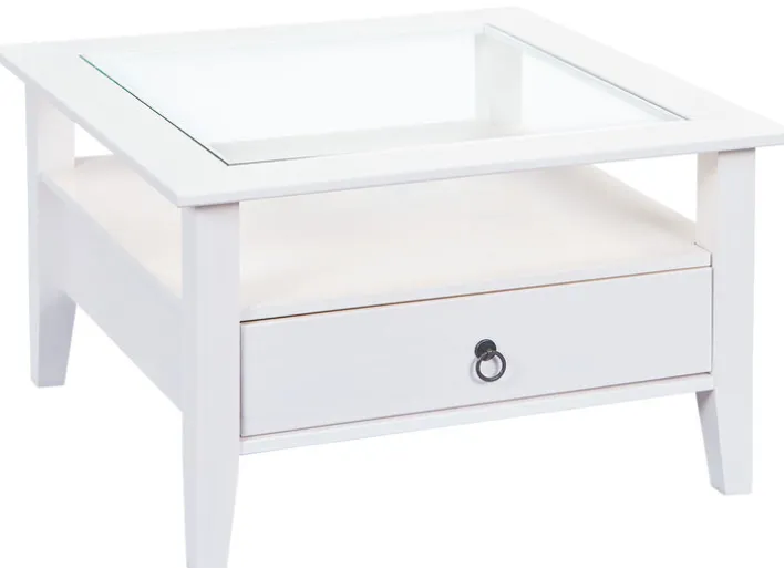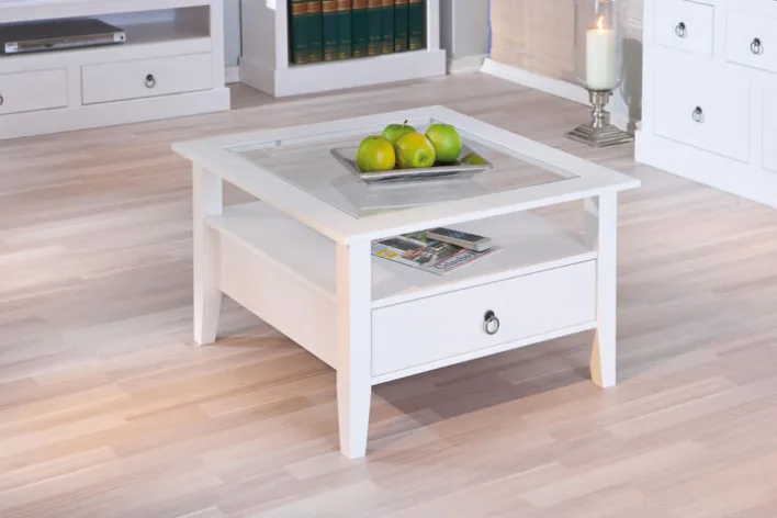 Der Couchtisch HENRY aus weiß lackiertem Kiefer Massivholz ist 75 cm breit, 45 cm hoch und 75 cm tief. Bei diesem Produkt sind Holz und Sicherheitsglas die verarbeiteten Materialien.