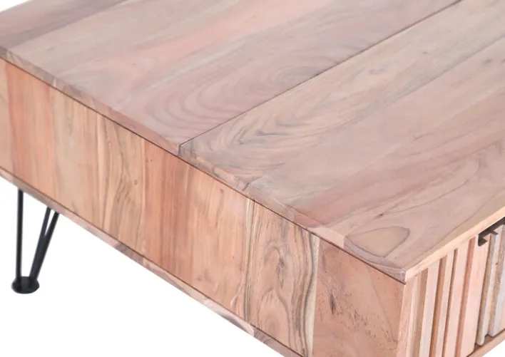 Mit seinem angesagten 60er-Jahre-Stil sorgt der Couchtisch HUDSON für einen Eyecatcher in jedem Wohnzimmer. Die hölzerne Tischplatte besteht aus einem schmalen Kasten mit einem kleinen Schubfach auf der linken Seite und einem großen, offen gehaltenen Fach auf der rechten Seite. Somit bietet der Tisch neben einer Ablagefläche auch willkommenen Stauraum. Jeweils drei abgeschrägte Metallstäbe zieren das Vierfußgestell und machen den Materialmix perfekt. Die Soft-Close-Funktion des Schubfachs macht dieses besonders angenehm im Gebrauch. Und auch von der Höhe fügt sich der Tisch mit seinen 40 bis 60 Zentimetern ideal in den Wohnbereich ein.