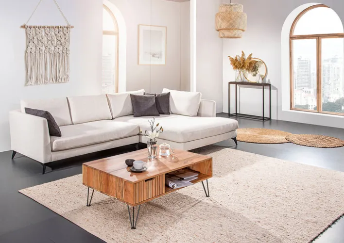 Bei dem 100 x 70 Zentimeter großen Couchtisch HUDSON treffen braunes Holz und schwarzes Metall aufeinander und bringen stilvolle Gemütlichkeit in den Raum.