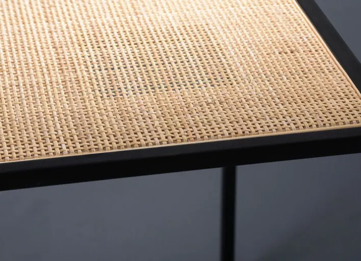 Die aufwendig gestalteten Tischplatten sind aus einem stabilen Rattangeflecht gefertigt. Die quadratischen Platten sind auf den Oberflächen lackiert und in das Gestell eingelegt. Die stabilen Gestelle sind aus hochwertig verarbeitetem Vierkantstahl gefertigt. Die Gestelle sind auf den Oberflächen schwarzfarbig lackiert.