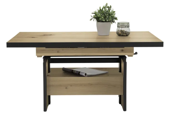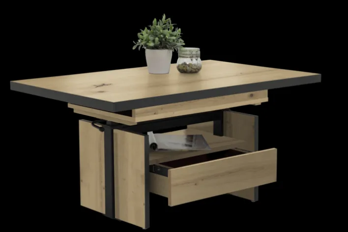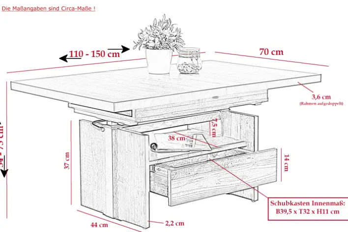 Der Tisch misst 110 cm Länge und lässt sich mit innenliegenden Einlegeplatten auf 150 cm Länge ausziehen. Er hat eine Breite von 70 cm. Die Höhe ist mittels Gasdruckfeder und Lift von 58 cm auf 76 cm verstellbar, sodass der Funktionscouchtisch die Höhe eines Esstisches erreicht. Er eignet sich gut als funktionaler Tisch im modernen Wohnbereich und ist für die Nutzung in Innenräumen konzipiert.