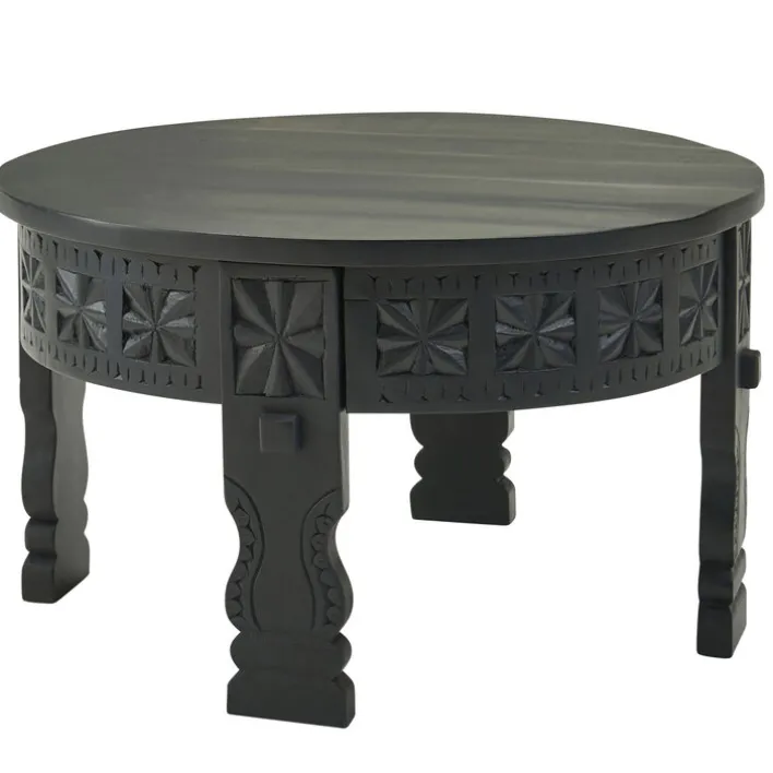 Vier Tischbeine in flacher Drechseloptik bilden den Abschluss unter dem Couchtisch rund aus massivem und schwarz lackiertem Mangoholz. Zusätzlich zieren feine Blattschnitzereien die Drechselbögen. Ebenfalls fallen viereckige Zimmermannsnägel im oberen Teil der Tischbeine auf. Diese Designvielfalt in einem Stück ergänzt nostalgische Einrichtungen, Rattanmöbel oder orientalische Wohnzimmer ideal. Optik, Stabilität und Farbe bleiben am besten erhalten, wenn der Couchtisch in trockenen Innenräumen ohne direkte Sonneneinstrahlung platziert wird.