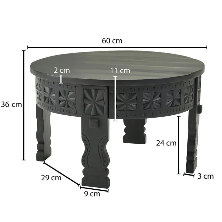 Der Couchtisch rund 60 cm Mango massiv Schwarz ist ein elegantes Designerstück mit Kerbschnitzerei am Rand der Tischplatte sowie den Tischbeinen. Er ist 36 cm hoch, wiegt 17 kg und kann bis 15 kg belastet werden.