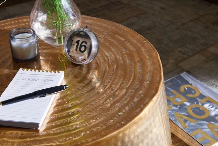Der 60 x 36 cm große Couchtisch ist eine spannende Idee, um den Wohnbereich optisch aufzulockern. Womit das gute Stück sofort neugierige Blicke anzieht, ist seine goldfarbene Oberfläche mit ihrer einzigartigen Hammerschlag-Optik.