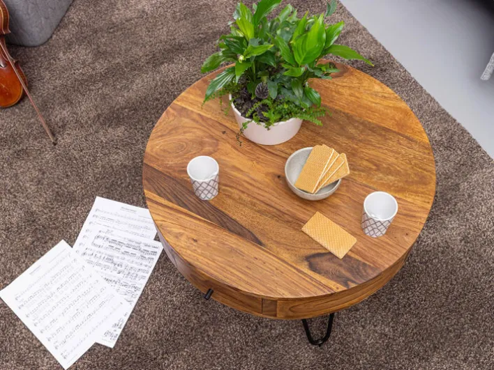 Der Couchtisch hat einen Durchmesser von 60 cm, er ist 44 cm hoch. Er ist aus massivem Sheesham und verfügt über einen Schubkasten. Seine Füße sind aus schwarzem, pulverbeschichtetem Schmiedeisen.