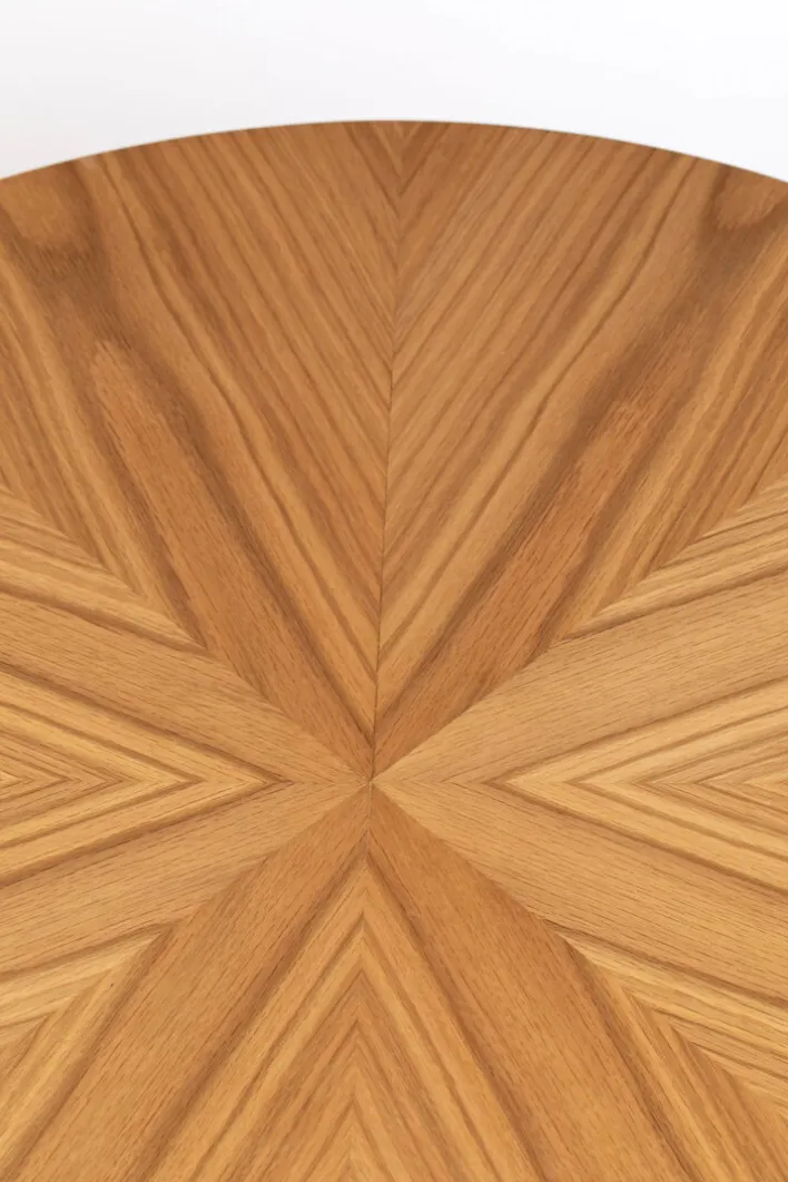 Der runde Couchtisch FABIO misst 80 cm im Durchmesser. Er besteht aus Eiche. Das Vierfußgestell mit seinen runden Beinen ist dabei massiv, die Tischplatte ist 18 mm hoch furniert und daher teilmassiv.