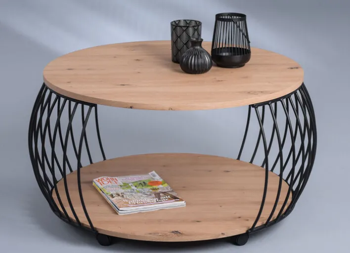 Die runde Tischplatte und die darunter befindliche Ablage aus Holz bieten viel Stauraum für Fernbedienungen, Zeitschriften, Bücher und Wohnaccessoires. Die Tischplatte und die Bodenplatte des runden Couchtischs sind aus Holznachbildung Artisaneiche. Die schön gemaserten Oberflächen der Platten sind foliert. Das Gestell des Couchtischs ist aus stabilem Metall. Das Gestell ist in der Farbe schwarz lackiert. Auf der unteren Bodenplatte sind Möbelrollen angebracht. #porta #portamöbel #meinzuhause