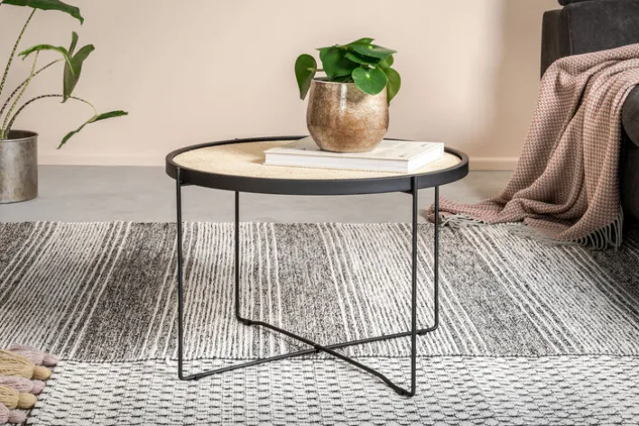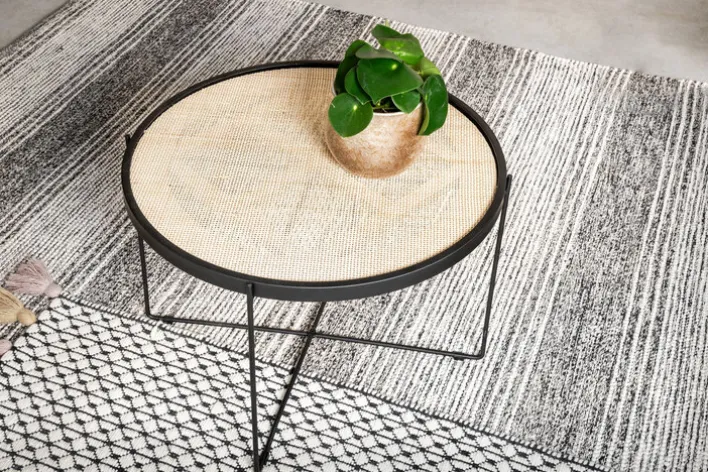 Eine schlichte Formensprache und ausgefallene Materialkombination verleihen dem Couchtisch LORENZ mit 58 cm Durchmesser ein ganz besonderes Flair. Das schwarze Metallgestell kommt in Kombination mit der runden Tischplatte aus braunem Rattangeflecht hervorragend zur Geltung.