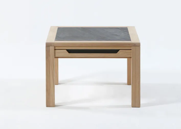 aus Holzarten ähnlicher Farbtöne. Die schwarze Naturschieferplatte gibt diesem Couchtisch noch das gewisse Etwas, das ihn zum