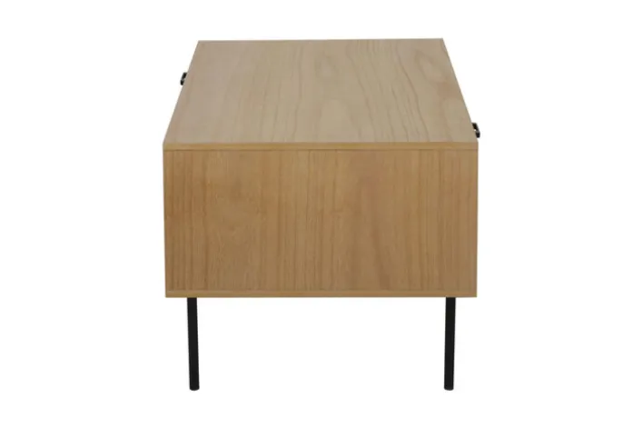 Das Design des praktischen Tischs mit dem Schubkasten, der neben dem offenen Ablagebereich integriert ist, erinnert an den Möbelstil der 50er Jahre. Korpus und Tischplatte bestehen aus einer leicht zu pflegenden mitteldichten Faserplatte, während die Front der Schublade aus Ratten gearbeitet ist. Die Oberfläche des Metalls der Füße ist wie der länglich arrangierte Griff des Schubkastens pulverbeschichtet.