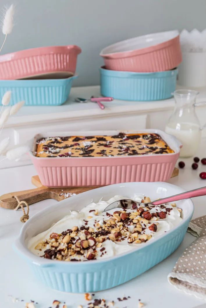Die CreaTable Auflaufform PASTELL KITCHEN mit einem Durchmesser von 24 cm ist aus robustem Steinzeug gefertigt. Außen ist die Form in blauer Pastellfarbe gehalten, während die Innenseite in strahlendem Weiß glänzt. Das klassische Design der Außenseite wird von einem markanten Streifenrelief unterstrichen. Die Auflaufform ist für Backofen und Mikrowelle geeignet und lässt sich anschließend unkompliziert in der Spülmaschine reinigen. Verwendbar ist die Auflaufform nicht nur für Aufläufe und Kuchen, sondern auch für Tiramisu und vieles mehr.